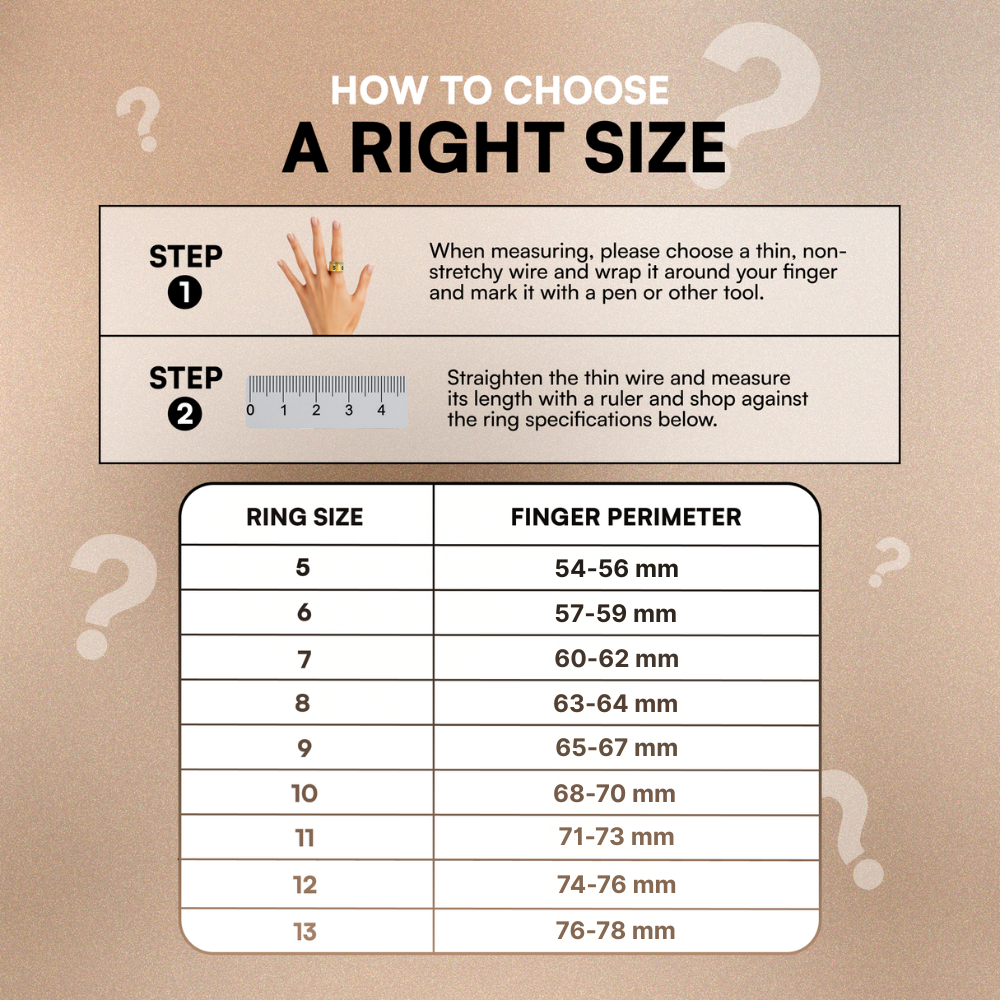 NOTE: The measurements shown are finger perimeters, taken by wrapping paper or tape around the base of your finger. These numbers may be slightly different from official US ring circumferences because they reflect the practical way your finger is measured, not the exact inner circumference of the metal ring.